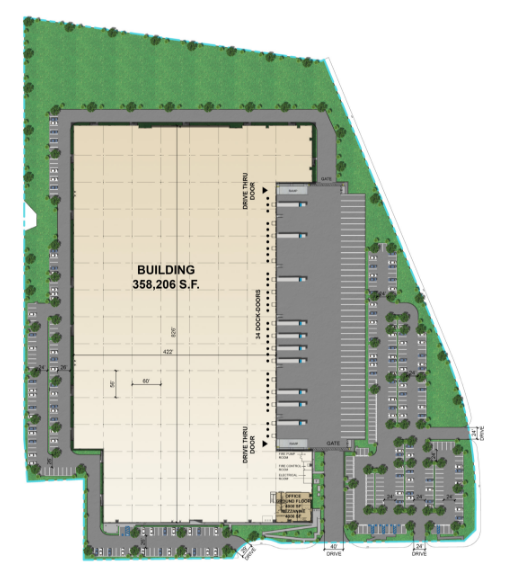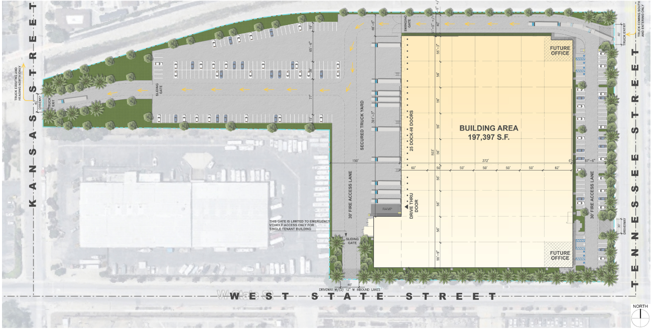 Scope of work: Construct a new one-story + mezzanine concrete tilt-up warehouse distribution facility with four dock levelers, site lighting, landscaping & irrigation, trash enclosure, concrete screen walls, and tube steel fencing gates.