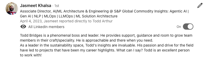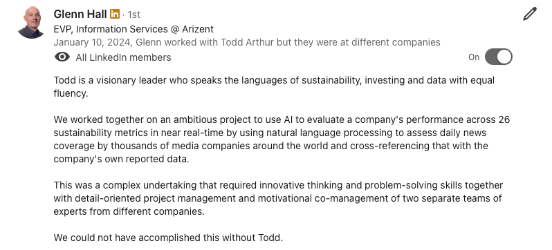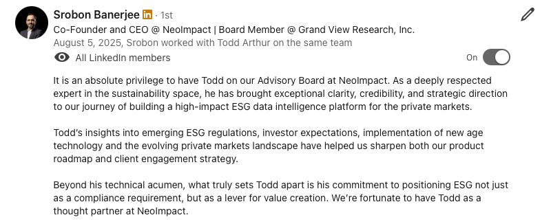 Todd has a deep passion for building products, technologies, and startups that create sustainable economic growth, generate sustainable return on investment (SROI), and help business and markets solve the world’s biggest challenges. He has built innovative solutions in the technology and financial services industries. His experiences within industry have given him the opportunity to develop global product strategy, fundraise (Seed to Series B) across the private capital markets, convert complex ideas into products (Zero to One), build innovative product roadmaps, build high-performing global teams, and advise clients on technology-enabled value creation and impact. His intellectual curiosity has driven him to develop deep domain expertise in climate, applied research, applied artificial intelligence, product solutions, technology solutions, and sustainable investing. He has built partnerships with companies across the ecosystem - including Bloomberg, NASDAQ, S&P Global, Google, BCG, Accenture, Morningstar, Goldman Sachs, JPMorgan, Allianz Group, DWS, State Street Global Advisors, Blackstone, Bridgewater, and BNY Mellon. Todd has contributed to consultations for the European Commission, SEC, SASB, IFRS ISSB, TCFD, SBTi, GRI, and ESG Data Convergence Initiative. He enjoys working with clients to build technology to drive sustainable growth, develop new innovative products, and accelerate their net-zero climate transitions.